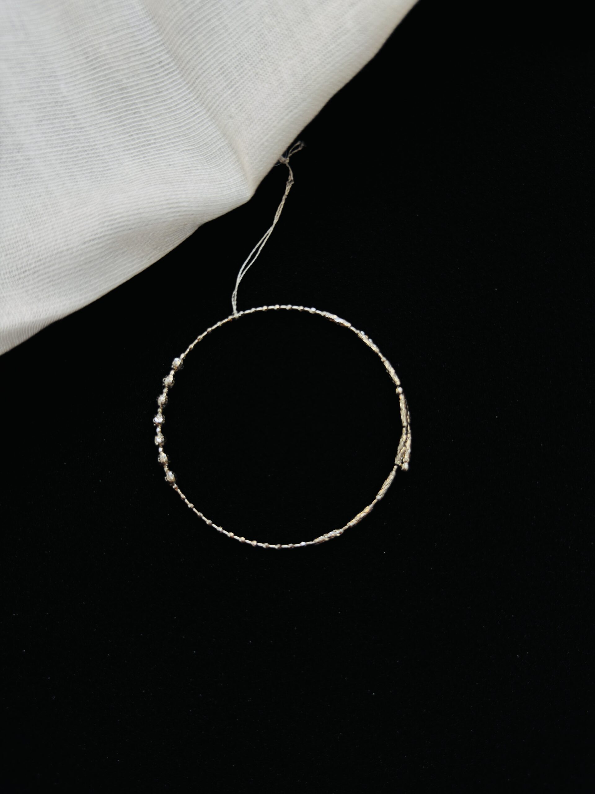 上質なK18ホワイトゴールドを使用した、4mmクロスラインデザインのバングル。 繊細に施されたラインが光を受けるたびに繊細に煌めき、上品で洗練された印象を与えます。